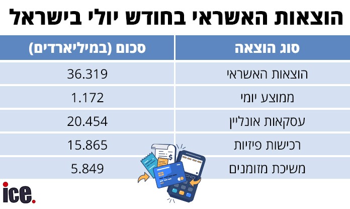 במהלך יולי האחרון הוציאו הישראלים בכרטיסי אשראי בסכום כולל של 36.319 מיליארד שקלים, שאת לעומת סכום של 31.162 מיליארד שקלים שהוציאו ביולי אשתקד. הסכום בחודש שעבר גבוה ב-4.54% מהסכום שהוציאו הישראלים בחודש יוני שעמד על 34.732 מיליארד שקלים.