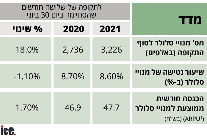 ממצבת מנויי הסלולר של החברה הסתכמה ב-30 ביוני 2021 ב-3.226 מיליון לקוחות, לעומת 2.734 מיליון לקוחות ב-30 ביוני 2020. לצד זאת, שיעור הנטישה בקרב מנויי הסלולר ברבעון השני של שנת 2020 הסתכם ב-8.6%, בהשוואה ל-8.7% ברבעון המקביל אשתקד.