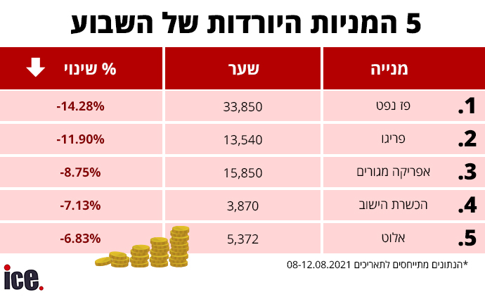פז נפט מוליכה את המניות היורדות של השבוע עם 14.28% שנגרעו משוויה, בדרך לשער של 33,850 אג', פריגו שנייה עם ירידה של 11.90% ל-13,540 אג', אפריקה מגורים שלישית בשל איבוד של 8.75% מערכה ושער חדש של 15,850 אג', הכשרת היישוב ירדה ב-7.13% ל-3,870 אג', אלוט סוגרת את החמישייה עם ירידה של 6.83% ושער של 5,372 אג'.