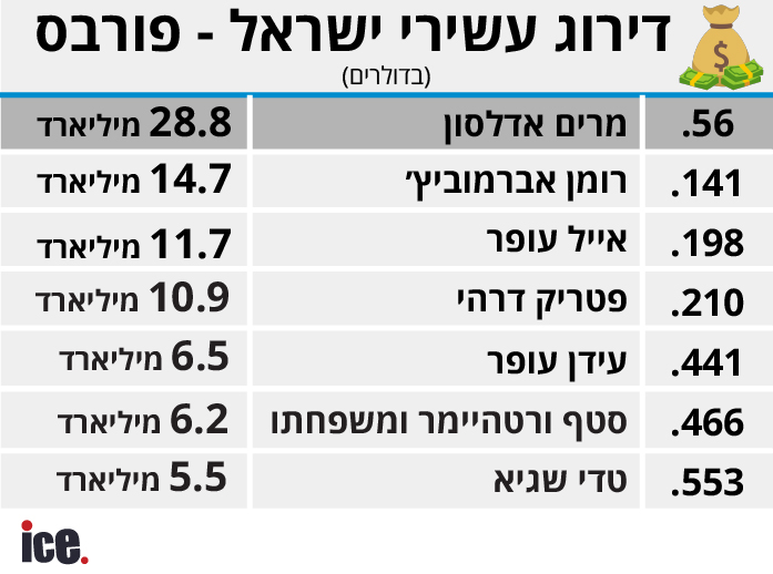 דירוג עשירי ישראל על פי מגזין פורבס. מרים אדלסון ממשיכה להוביל את הטבלה של המיליארדרים הישראלים עם הון המוערך ב-28.8 מיליארד דולר והיא ניצבת במקום ה-56 המכובד בדירוג העולמי של פורבס.