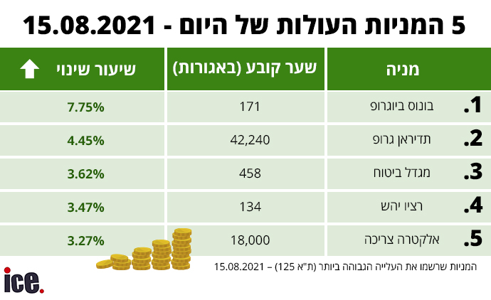 המסחר בבורסה ננעל בעליית שערים, ומניית בונוס ביוגרופ מזנקת ב-7.75% והיא המובילה מבין חמש המניות העולות של היום. איזו מניה ירדה הכי הרבה? | כל הפרטים על סיכום המסחר בבורסה