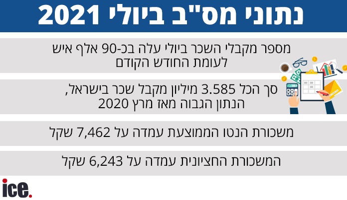 על פי נתוני מס"ב: מספר מקבלי השכר ביולי עלה בכ-90 אלף איש לעומת החודש הקודם והגיע ל-3.585 מיליון איש – הנתון הגבוה ביותר מאז מרץ 2020, משכורת הנטו הממוצעת עמדה על 7,462.33 שקל והמשכורת החציונית עמדה על 6,243 שקל