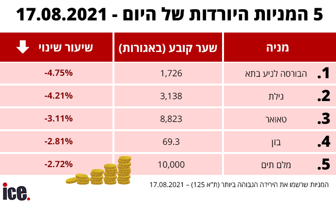 את טבלת המניות היורדות מובילה הבורסה לניירות ערך שירדה ב-4.75% ל-1,726 אג', גילת איבדה 4.21% מערכה בדרך ל-3,138 אג', טאואר במקום השלישי בשל ירידה של 3.11% מערכה ל-8,823 אג', בזן רביעית עם שער של 69.3 אג' אחרי איבוד של 2.81% מערכה וסוגרת את החמישייה מלם תים שירדה ב-2.72% לשער של 10,000 אג'.