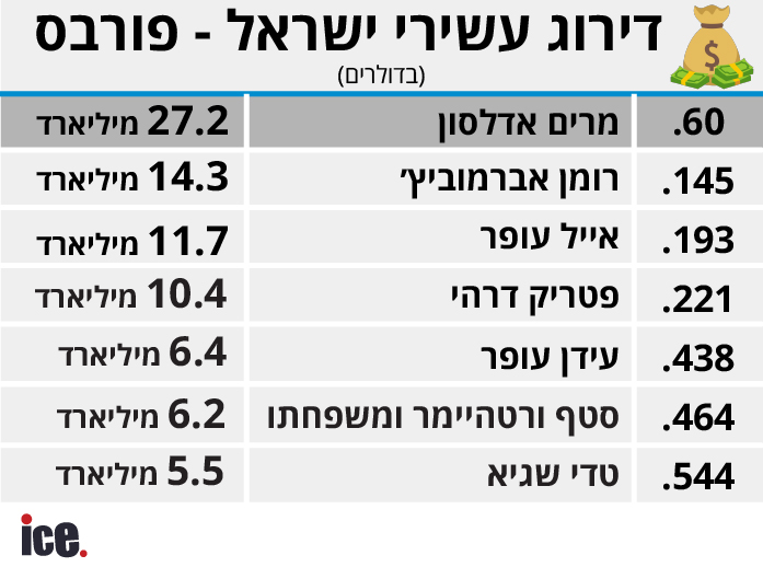 במקום הראשון מבין הישראלים: מרים אדלסון, אלמנתו של שלדון אדלסון, הממוקמת במקום ה-60 בדירוג העשירים העולמי והיא עם הון מוערך ב-27.2 מיליארד דולר לאחר שהשבוע איבדה הון המוערך ב-1.6 מיליארד דולר. במקום השני, רומן אברמוביץ', האוליגרך הישראלי-רוסי, עם הון מוערך ב-14.3 מיליארד דולר ניצב במקום ה-145 העולמי.
