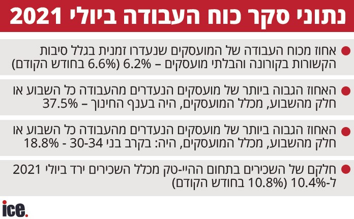 הלשכה המרכזית לסטטיסטיקה פרסמה היום (שני) את הנתונים מסקר כוח אדם לחודש יולי 2021, במוקד: אחוז הבלתי מועסקים מכוח העבודה ירד ל-5.2% מרמה של 5.4 בחודש הקודם.