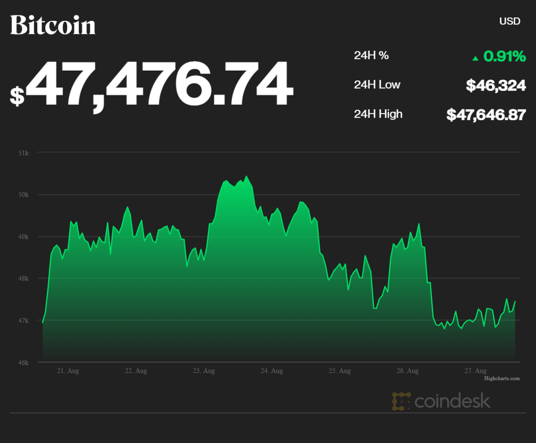 הביטקוין סיים שבוע מוצלח עם עלייה של כאחוז מ-46,960 ל-47,476.74 דולר (נכון לכתיבת שורות אלה), גם שווי השוק של המטבע הבכיר עלה מעט במהלך השבוע החולף והתייצב על 893.18 מיליארד דולר בסך הכל.