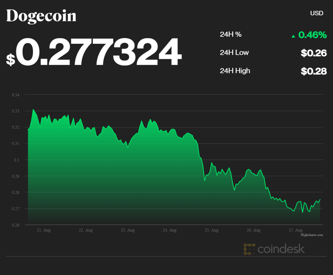 הדוג'קוין רשם ירידה משמעותית, כאשר החל את השבוע ב-0.319 דולר וירד עד כדי 0.277 דולר בלבד, אובדן של כ-13% בסך הכל, גם שווי השוק שלו ירד ל-36.60 מיליארד דולר בלבד.