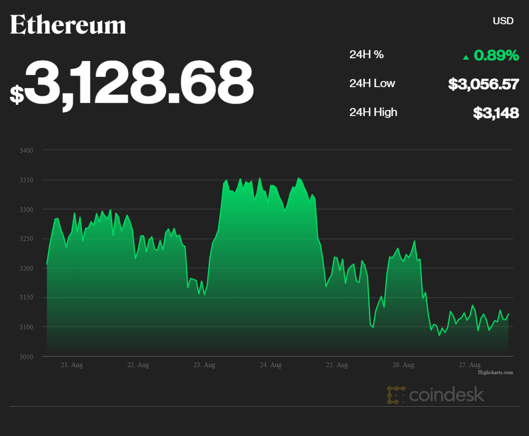 האתריום לעומת הביטקוין, דווקא נחלש ב-7 הימים האחרונים, כאשר ירד מ-3,205 דולר ל-3,128.68 דולר, כ-3% פחות, גם שווי השוק של המטבע נפגע וירד ל-366.60 מיליארד דולר בלבד.