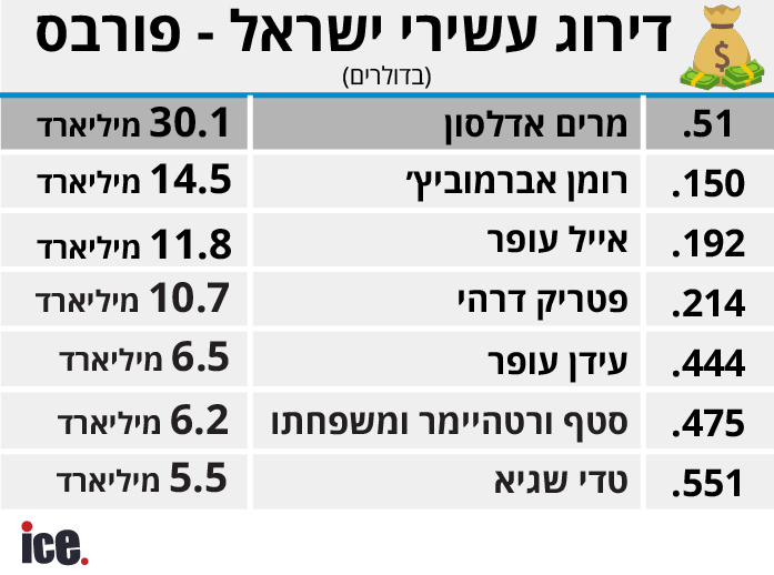 דירוג עשירי ישראל על פי מגזין פורבס, בזמן שדירוג עשירי העולם סיפק דרמות ותהפוכות בשבוע האחרון, מצב הישראלים לא היה דרמטי במיוחד למעט מרים אדלסון שהגדילה את הונה בכ-2.9 מיליארד דולר בשבוע האחרון.