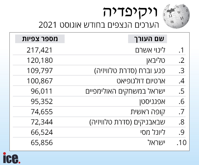 עם כל הכבוד למדליסטים האולימפיים הישראלים בטוקיו, נראה שתשומת הלב של תושבי ישראל סטתה בחודש אוגוסט לנסיגה האמריקאית מאפגניסטן ולסדרות טלוויזיה פופולאריות, כך על פי טבלת הערכים הנצפים בוויקיפדיה העברית במהלך החודש.
