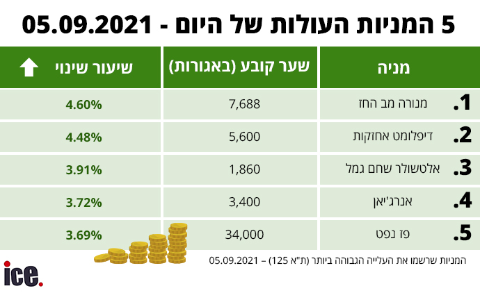 במניות העולות של היום: מניית מנורה מבטחים רשמה עלייה של 4.60% לשער של 7,688 אג'. דיפלומט אחזקות עם עלייה של 4.48% לשער של 5,600 אג'. מניית אלטשולר שחם גמל עלתה ב-3.91% לשער של 1,860 אג', מניית אנרג'יאן עלתה ב-3.72% לשער של 3,400 אג'. מניית פז נפט רשמה עלייה של 3.69% לשער של 34 אלף אג'.
