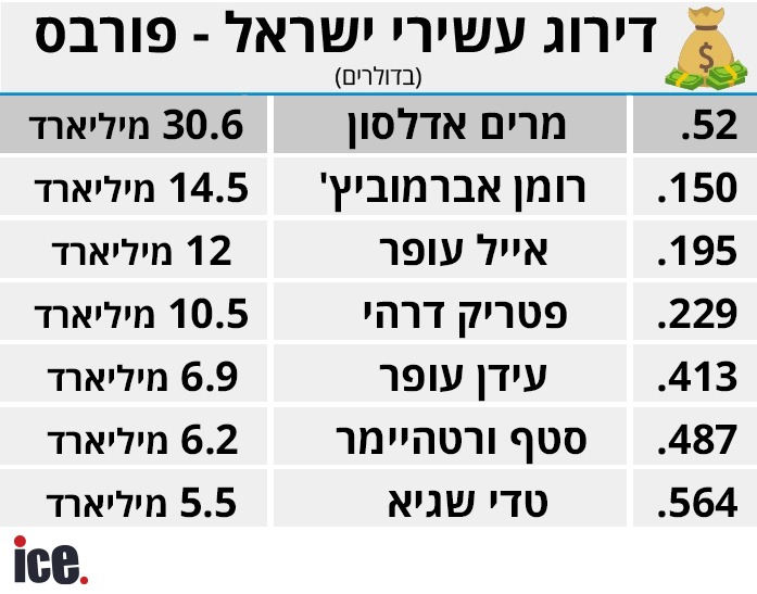 רוב עשירי ישראל איבדו השבוע חלק מהונם, מרים אדלסון ועידן עופר לעומת זאת חגגו, עידן עופר עופר הגדיל את הונו במאות מיליוני דולרים ועלה במיקום העולמי ב-24 מיקומים לפי דירוג פורבס | דירוג עשירי ישראל