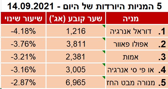 בראש טבלת המניות היורדות 'מככבת' דוראל אנרגיה שירדה ב-4.18% ל-1,216 אג', אפולו פאוור ירדה יום נוסף, הפעם ב-3.76% ל-3,811 אג', אמות שלישית לאחר שאיבדה 3.21% מערכה בדרך לשער של 2,381 אג', או פי סי אנרגיה בשל ירידה של 3.16% ל-3,005 אג', סוגרת את החמישייה מנורה מבטחים שירדה ב-2.87% ל-6,956 אג'.