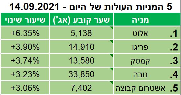 את טבלת המניות העולות של היום מוליכה אלוט שרשמה עלייה של 6.35% לשער של 5,138 אג', פריגו טיפסה ב-3.90% ל-14,910 אג', קמטק נסקה ב-3.74% ל-13,580 אג', נובה עלתה ב-3.23% ל-33,850 אג' וסוגרת את החמישייה אשטרום קבוצה שרשמה עליה של 3.06% בדרך ל-7,402 אג'.