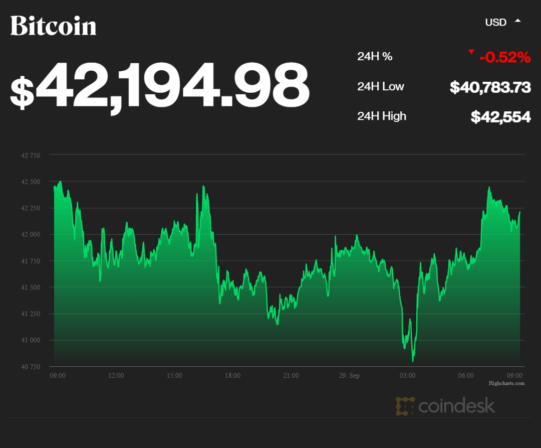 הביטקוין, מטבע הקריפטו הבכיר בשוק, ירד בשיעור של 0.52% לשער של 42,194.98 דולר ליחידה, כאשר שווי השוק שלו צנח שוב מתחת ל-800 מיליארד דולר, לשווי של 794.48 מיליארד דולר בלבד.