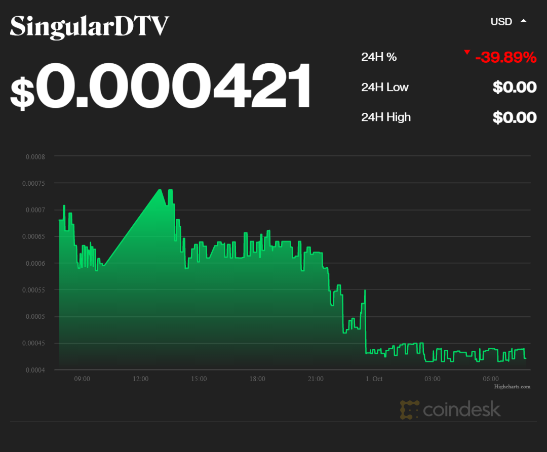 מטבע סינגולאר DTV על סף מחיקה. אחרי שבועות של ירידות, ההתרסקות שחווה ביממה האחרונה מקרבת אותו לנקודת אל חזור ושווי של כמעט 0 דולר מוחלט, בעקבות ירידה של 47% אמש ועוד כ-40% היום (שישי) אחרי לילה של צניחה דרסטית.