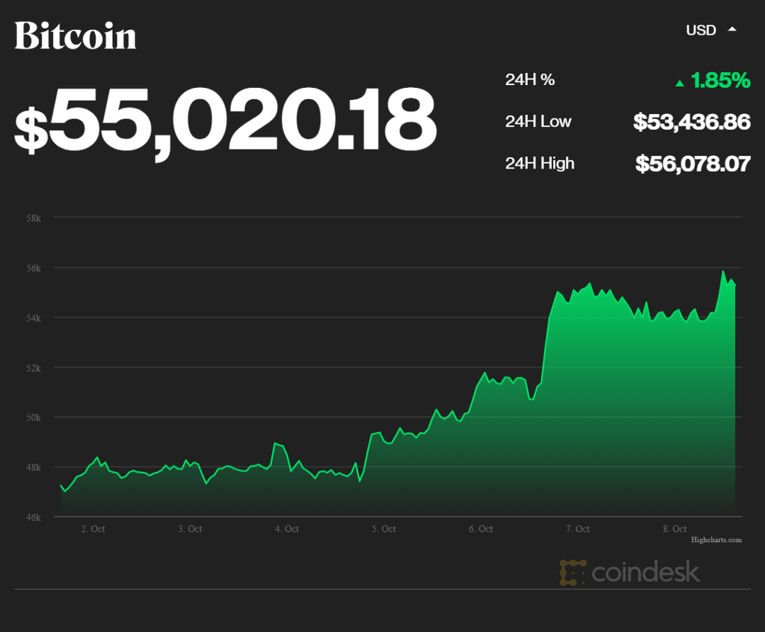 הביטקוין הגיע לשער של 55,020.18 דולר ליחידה, כאשר שווי השוק שלו זינק במהלך השבוע ל-1.04 טריליון דולר, זאת בזכות עלייה נהדרת של 1.85% ביממה האחרונה, אבל הסיפור הגדולה הוא השבוע האחרון, בו זינק מטבע הקריפטו הבכיר מרמה של 47,228 דולר בכמעט 8,000 דולר, שמהווים קפיצה של למעלה מ-17% תוך שבוע, כאשר כבר היה לרגע ב-56 אלף דולר.