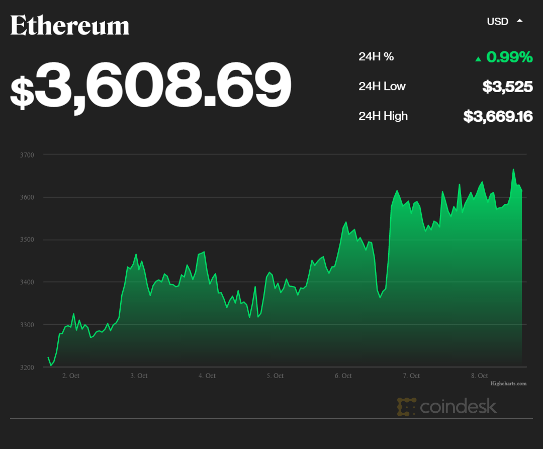 האתריום טיפס במהלך השבוע האחרון לרמה של 3,608.69 דולר בסך הכל, כולל עלייה של 0.99% ביממה האחרונה, מה שגם הגדיל את שווי השוק של המטבע השני בחשיבותו ל-423.08 מיליארד דולר. את השבוע החל האתריום ב-3,222 דולר, כך שהקפיצה שעשה בכמעט 400 דולר, הייתה שווה לו עלייה שבועית של כ-12% בסך הכל.