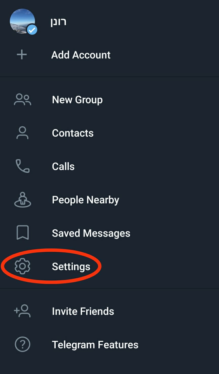 ראשית כנסו לאפליקציית טלגרם ולחצו על 3 הפסים בצד שמאל למעלה. לאחר מכן על לחצן ההגדרות: