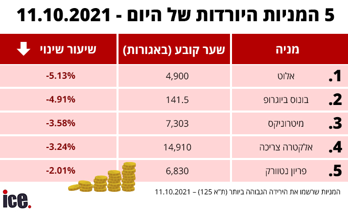 במניות היורדות של היום: מניית אלוט ירדה ב-5.13% לשער של 4,900 אג'. מניית בונוס ביוגרופ ירדה ב-4.91% לשער של 141.5 אג'. מניית מיטרוניקס רשמה ירידה של 3.58% לשער של 7,303 אג'. מניית אלקטרה צריכה רשמה ירידה של 3.24% לשער של 14,910 אג'. מניית פריון נטוורק רשמה ירידה של 2.01% לשער של 6,830 אג'.