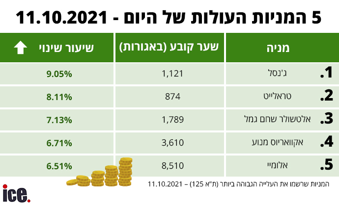 במניות העולות של היום: המנייה שרשמה את העלייה הגדולה ביותר היא ג'נסל שעלתה ב-9.05% לשער של 1,121 אג', מניית טראלייט רשמה עלייה של 8.11% לשער של 874 אג', מניית אלטשולר שחם גמל רשמה עלייה של 7.13% לשער של 1,789 אג'. מניית אקוואריוס מנוע רשמה עלייה ב-3,610 אג' ומניית אלומי רשמה עלייה של 6.51% לשער של 8,510 אג'.