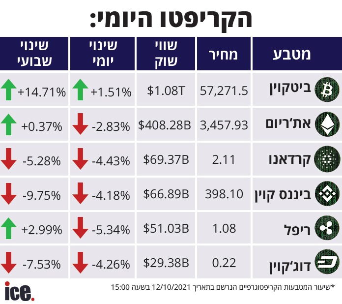 מטבע הקריפטו הבכיר טיפס ב-1.51% ביממה האחרונה והשלים עלייה מטורפת של 14.71% בשבוע בדרך לשער של 57,271 דולר. האתריום איבד מערכו 2.83% אך עלה במהלך השבוע. קרדאנו, דוג'קוין, ריפל וביננס קוין רשמו ירידות תלולות