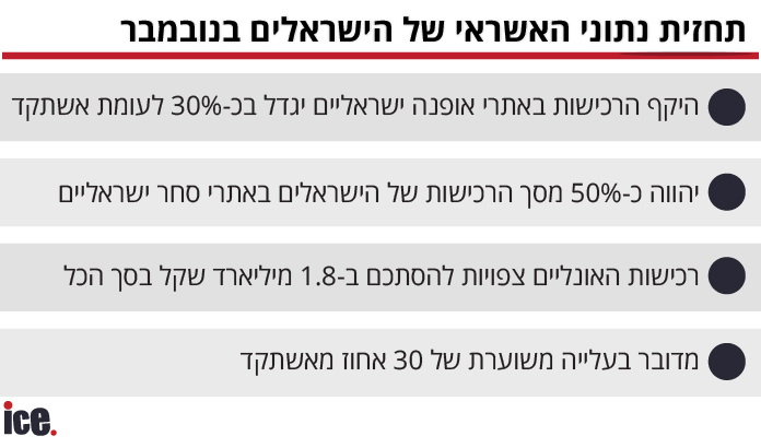 על פי הניתוח היקף הרכישות אונליין של הישראלים בחודש נובמבר השנה צפוי לעמוד על כ-1.8 מיליארד שקל בסך הכל, מדובר בעלייה של כ-30% לעומת נובמבר אשתקד שהסתכם בכ-1.4 מיליארד שקל בלבד. 60% מתוך כלל הרכישות צפויות להתבצע באתרי סחר זרים, בעוד שהיקף הרכישות באתרים זרים יציג גידול משמעותי של כ-40% לעומת נובמבר אשתקד, ולראשונה בישראל יחצה את רף מיליארד השקלים בהיקף הרכישות החודשי באתרי סחר זרים.