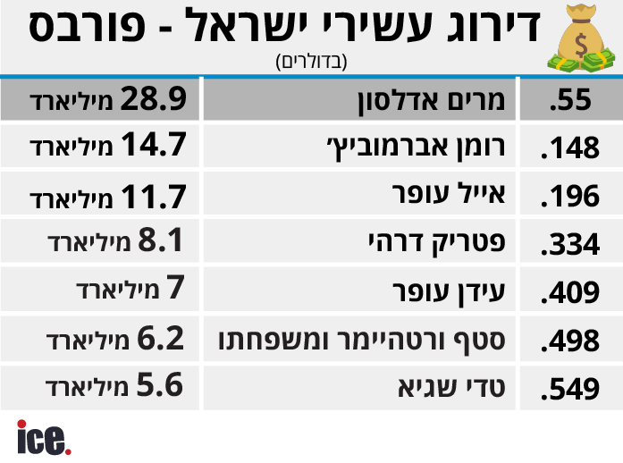 דירוג עשירי ישראל על פי המגזין הבינלאומי "פורבס": האישה העשירה בישראל, ד"ר מרים אדלסון, בשבוע האחרון אדלסון הכניסה 400 מיליון דולר ועלתה מהמקום ה-60 למקום ה-55 בדירוג עשירי העולם עם הון המוערך ב-28.9 מיליארד דולר.