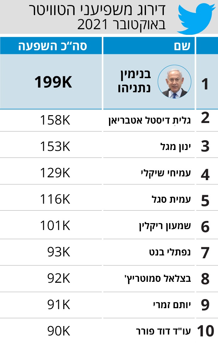 נחשף דירוג המשפיעים בישראל של טוויטר לחודש אוקטובר. בראש הרשימה, יו"ר האופוזיציה וראש הממשלה לשעבר בנימין נתניהו, מיד אחריו חברת הכנסת גלית דיסטל אטבריאן שעשתה מהפך עם ינון מגל שבדוח הרבעוני היה במקום השני וכעת הוא במקום השלישי. עמיחי שיקלי תופס את המקום הרביעי.