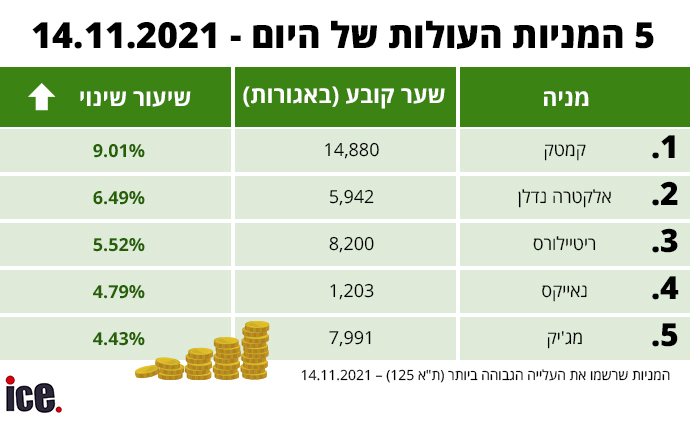 מניית חברת טכנולוגיית ייצור השבבים קמטק היא העולה הגדולה של היום, עם שינוי בשיעור של 9.01% למחיר של 14,880 אג'; אלקטרה נדל"ן, שהודיעה היום על אישור מכרז למקבץ דיור בפלורידה ועל כניסה לתחום המשרדים בבריטניה, עלתה בשיעור של 6.49% למחיר של 5,942 אג' למניה; חברת ייבוא הביגוד וההנעלה ריטיילורס, חברת-הבת של פוקס לתום מוצרי הספורט, עלתה בשיעור של 5.52% למחיר של 8,200 אג' למניה; חברת פתרונות הסליקה נאייקס עלתה בשיעור של 4.79% למחיר של 1,203 אג' למניה; וחברת התוכנה מג'יק עלתה ב-4.43% למחיר של 7,991 אג' למניה.