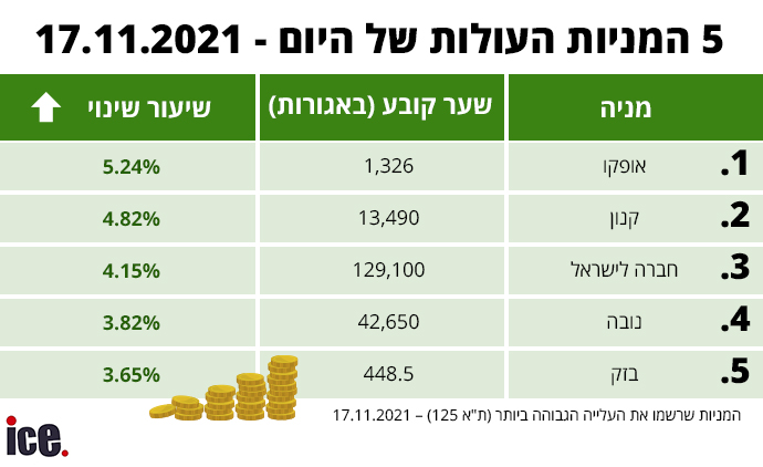 במניות העולות של היום: מניית אופקו עשתה את העלייה הגדולה ביותר בשיעור של 5.24% לשער של 1,326 אג'. מניית קנון עלתה ב-4.82% לשער של 13,490 אג'. מניית חברה לישראל עלתה ב-4.15% לשער של 129,100 אג'. מניית נובה עלתה ב-3.82% לשער של 42,650 אג'. ומניית בזק נועלת את החמישייה של המניות שעשו את העלייה הגדולה ביותר עם עלייה של 3.65% לשער של 448.5 אג'.