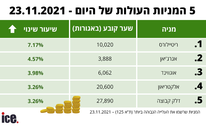 מניית ריטיילורס מקבוצת פוקס ממשיכה לזנק גם היום בעקבות הדו"ח הרבעוני המצוין שפרסמה אתמול. היום היא עלתה בשיעור של 7.17% למחיר של 10,020 אג'; חברת חיפושי הדלק אנרג'יאן עלתה בשיעור של 4.57% למחיר של 3,888 אג' למניה, לאחר שאתמול אמר מנכ"ל דלק קידוחים, יוסי אבו, בוועידת האנרגיה כי הביקוש לגז הטבעי, כמו זה מהמאגרים "כריש" ו"תנין" שאותם רכשה מדלק ב-2016 תמורת מקדמה בגובה 40 מיליון דולר, נמצא בשיא; חברת אנרגיית האוויר אוגווינד עלתה בשיעור של 3.98% למחיר של 6,062 אג' למניה; אלקטריאון עלתה בשיעור של 3.26% למחיר של 20,600 אג' למניה; וקבוצת דלק, שמלבד חשיפת המנכ"ל של חברת הבת שלה לגבי הביקושים לגז טבעי גם זכתה היום לדירוג "יציב" לאגרות החוב שהנפיקה מ"מדרוג", עלתה ב-3.26% למחיר של 27,890 אג'.