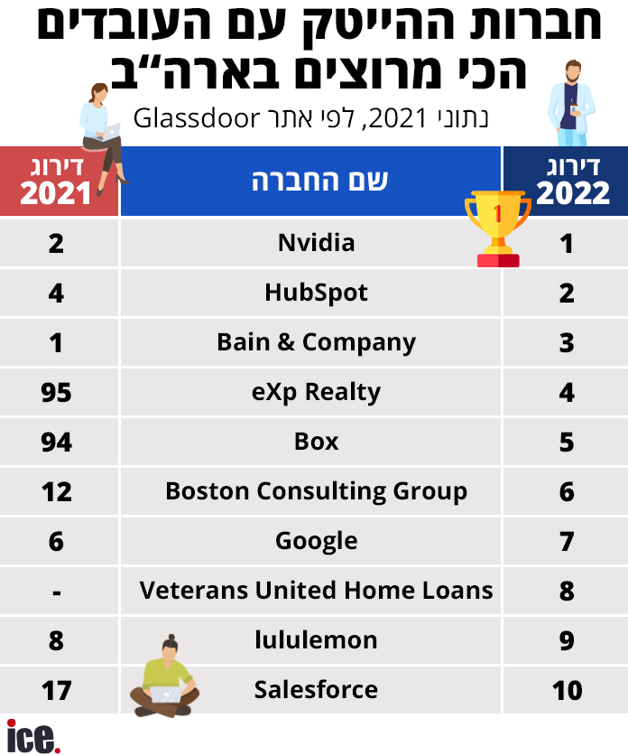 אתר Glassdoor, המאפשר לעובדים לכתוב ביקורות על מקומות עבודה בעילום שם כדי לאפשר יותר שקיפות לגבי תנאי עבודה ואטרקטיביות של תפקידים וחברות, פרסם את דירוג 100 מקומות העבודה הטובים ביותר בארה"ב לשנת 2022. הנתונים מבוססים על הביקורות שהועלו על ידי עובדי החברות במשך שנה שלמה – החל מאוקטובר 2020 ועד אוקטובר 2021.