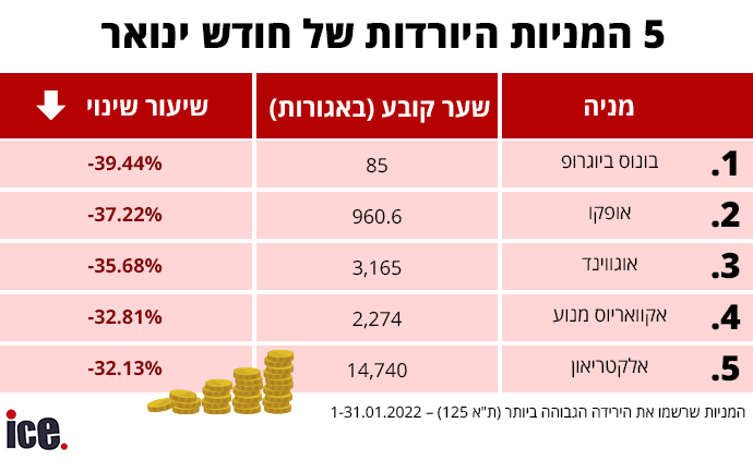ברשימת החברות שרשמו ירידות משמעותיות ניתן למצוא בעיקר חברות ביומד (טכנולוגיות רפואיות) ואנרגיה חלופית: בונוס ביוגרופ התרסקה בשיעור של 39.44% למחיר של 85 אג'; אופקו הלת' צנחה בשיעור של 37.22% למחיר של 960.6 אג'; אוגווינד ירדה בשיעור של 35.68% למחיר של 3,165 אג'; אקוואריוס מנועים רשמה ירידה של 32.81% למחיר של 2,274 אג'; ואלקטריאון של הנשיא לשעבר רובי ריבלין מחקה 32.13% משווי המניה למחיר של 14,740 אג'.