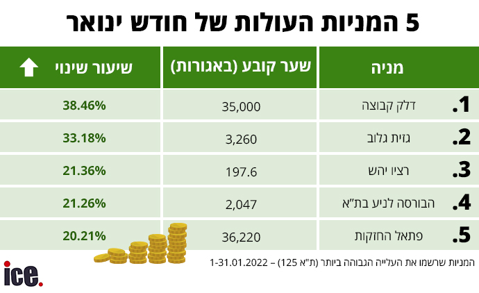 מי שחוו בחודש הזה עדנה הן חברות מתחומי הנפט והנדל"ן, שהמחירים בהם לא מפסיקים לעלות לאור המצב העולמי: קבוצת דלק זינקה בינואר בשיעור של 38.46% למחיר של 35,000 אג' למניה; גזית גלוב רשמה נסיקה בשיעור של 33.18% למחיר של 3,260 אג'; רציו יה"ש עלתה בשיעור של 21.36% למחיר של 197.6 אג' למניה; מניית הבורסה עצמה עלתה ב-21.26% למחיר של 2,047 אג'; ומניית פתאל החזקות עלתה בשיעור של 20.21% למחיר של 36,220 אג'.