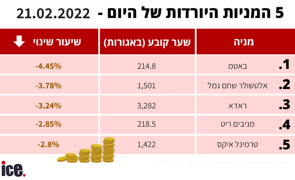 הירידה המשמעותית של היום נרשמה על ידי חברת הטכנולוגיה הצבאית באטמ, עם שיעור שינוי של 4.45% למחיר של 214.8 אג'; אלטשולר שחם רשמה ירידה בשיעור של 3.78% למחיר של 1,501 אג'; חברת טכנולוגיה צבאית נוספת, ראדא, ירדה בשיעור של 3.24% למחיר של 3,282 אג'; קרן השקעות הנדל"ן מניבים ריט רשמה ירידה בשיעור של 2.85% למחיר של 218.5%; ומותג הביגוד טרמינל איקס מקבוצת פוקס של הראל ויזל ירדה בשיעור של 2.8% למחיר של 1,422 אג'.