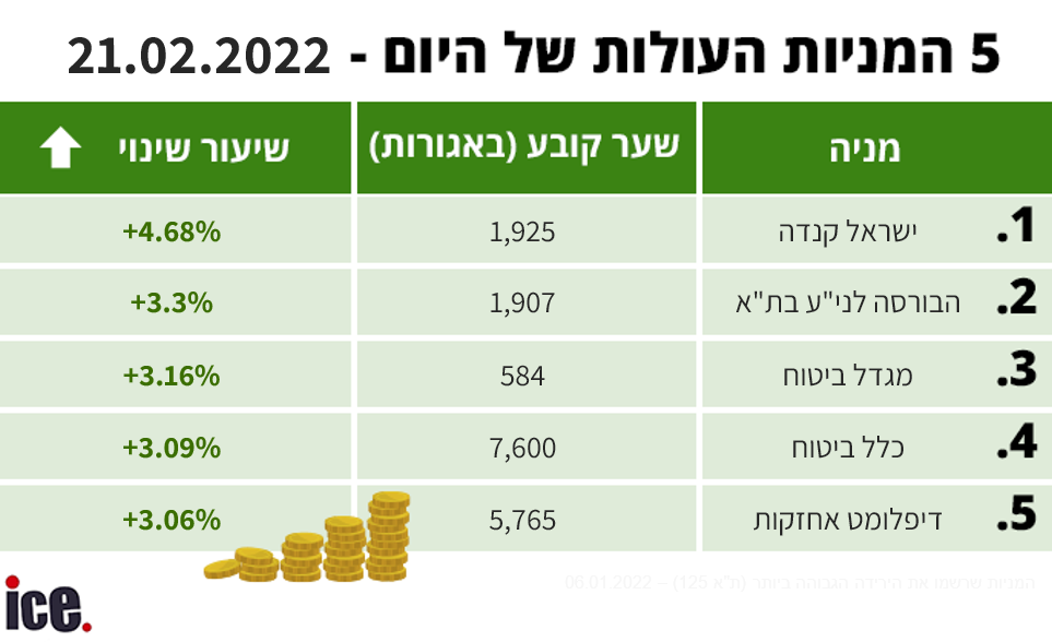 המניה שרשמה היום את העלייה הגדולה ביותר היתה זו של חברת הנדל"ן ישראל קנדה, עם שיעור שינוי של 4.68% ומחיר עדכני של 1,925 אג'; אחריה נמצאת מניית הבורסה עצמה, שעלתה בשיעור של 3.3% למחיר של 1,907 אג'; חברות הביטוח מגדל וכלל נמצאות שתיהן במקומות סמוכים ברשימה, כאשר הראשונה עלתה בשיעור של 3.16% למחיר של 584 אג' והשנייה עלתה בשיעור של 3.09% למחיר של 7,600 אג'; וענקית המזון דיפלומט סוגרת את החמישייה עם עלייה בשיעור של 3.06% למחיר של 5,765 אג'.