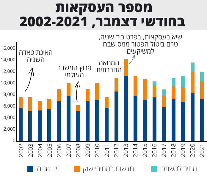 כאמור, בסיכום שנתי הגיע מספר העסקאות בשנת 2021 לרמתו ההיסטורית הגבוהה ביותר-150.8 אלף עסקאות, רמה הגבוהה ב-27% מהשיא הקודם שנרשם בשנת 2015, כאשר גם אז הושפעה רמת העסקאות הגבוהה במידה רבה מגל רכישות משקיעים, טרם הכבדת מס הרכישה עליהם. בהשוואה לשנת 2020 זהו גידול של 40%. בניכוי העסקאות במסגרת "מחיר למשתכן" עמד מספר העסקאות בשוק החופשי בשנת 2021 על 136.2 אלף, גם כן רמה שיא היסטורי, הגבוהה ב-14% מרמת השיא הקודם שנרשמה בשנת 2015. בהשוואה לשנת 2020 זהו גידול של 46%.