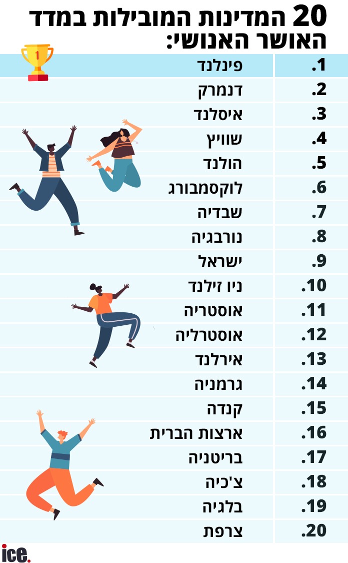 ומי המדינות המאושרות בעולם? לפני שנגיע לישראל, צריך לתת את הכבוד למדינות הסקנדינביות, שתופסות את כל שלושת המקומות על הפודיום - פינלנד תופסת את המקום הראשון כאומה המאושרת בעולם ועושה זאת זו שנה חמישית ברציפות. מיד אחריה ניצבות דנמרק במקום השני ואיסלנד הקטנה במקום השלישי, במה שמוכיח שלתנאי מזה האוויר, כנראה, אין השפעה ישירה על מדד האושר של האוכלוסיה בכל מדינה באשר היא.