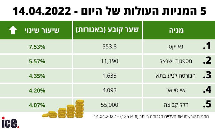 חברת פתרונות הסליקה נאייקס עלה בשיעור הגבוה ביותר היום – 7.53% - למחיר של 553.8 אג'; מספנות ישראל רשמה עלייה בשיעור של 5.57% למחיר של 11,190 אג'; מניית הבורסה עצמה עלתה בשיעור של 4.35% למחיר של 1,633 אג'; איי.סי.אל, המחזיקה בחברות הפקת ועיבוד כימיקלים וחומרים אחרים, עלתה בשיעור של 4.2% למחיר של 4,093 אג'; וקבוצת דלק של יצחק תשובה, שהודיעה על העלאת דירוג בעקבות העסקה של חברת הבת איתקה עם Siccar Point Energy האירופית, רשמה עלייה בשיעור של 4.07% למחיר של 55,000 אג'.