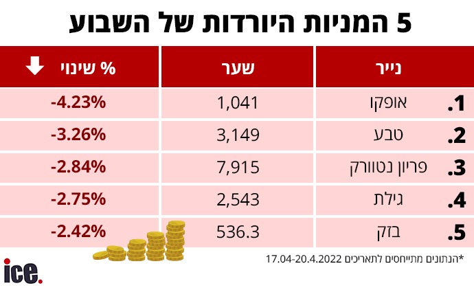 במקום השלישי: פריון נטוורק עם ירידה של 2.84% לשער של 7,915 אג'. אחריה: גילת עם ירידה של 2.75% לשער של 2,543 אג'. סוגרת את החמישייה: מניית בזק עם ירידה בשיעור של 2.425 לשער של 536.3 אג'.