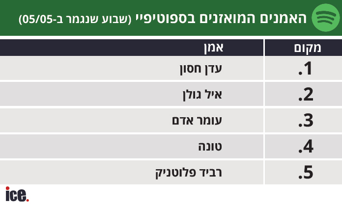 עדן חסון מצליח השבוע לרשום הישג נוסף ולהפוך לזמר המואזן בישראל לפי אפליקציית המוזיקה הגדולה בעולם, ספוטיפיי; חסון מדיח את איל גולן למקום השני; במקום השלישי דורך עומר אדם; ברביעי נשאר טונה; ובחמישי עדיין נמצא רביד פלוטניק.