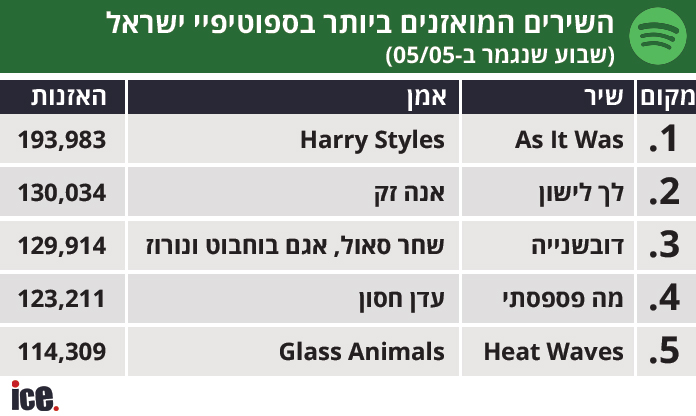 ברשימת השירים המואזנים ביותר באפליקציה ממשיך להוביל הארי סטיילס עם "As It Was", שהוא גם השיר היחיד שרושם נתוני האזנה ברי השוואה לאלו של המקום הראשון בשבוע רגיל, בעוד שאר השירים סובלים מאפקט ספירת העומר, שמנמיך את מספרי ההאזנות שלהם; במקום השני נשארת אנה זק עם "לך לישון"; במקום השלישי "דובשנייה" של שחר סאול, אגם בוחבוט ונורוז; השיר "מה פספסתי" של עדן חסון מזנק שני מקומות למקום הרביעי; ומדיח את "Heat Waves" של גלאס אנימלז למקום החמישי.