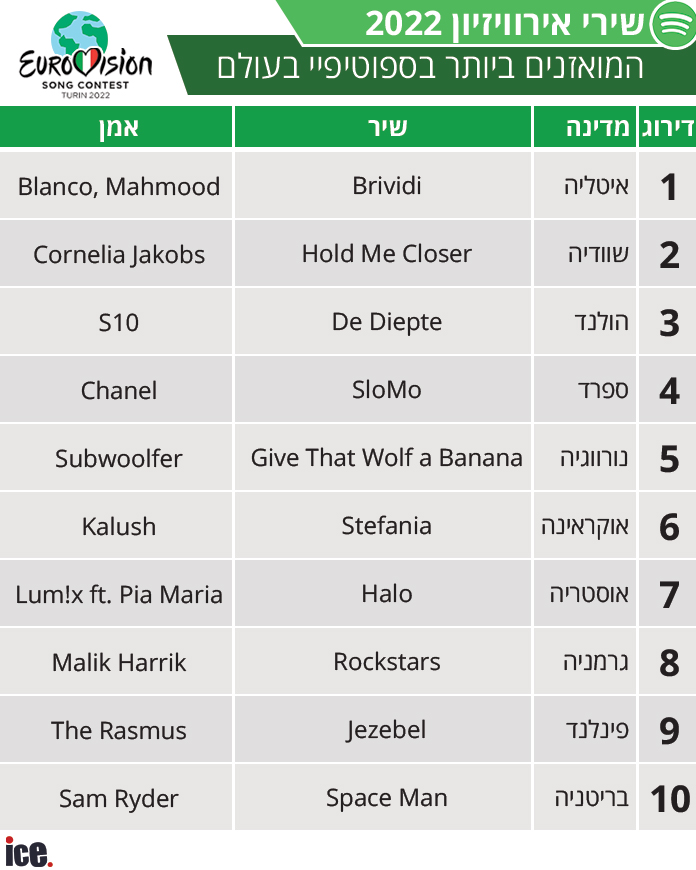 אפליקציית הזרמת המוזיקה הגדולה בעולם מנתחת את ההאזנות לשירי התחרות וחוזה מי השירים שיעלו לגמר. באיזה מקום נמצא השיר הישראלי?