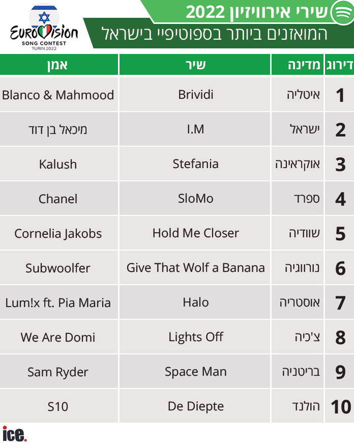 גם כאן בישראל מוביל השיר האיטלקי, ומקבל יותר האזנות אפילו מהשיר שלנו – "I.M" של מיכאל בן דוד, שמסתפק במקום השני; השיר האוקראיני מדורג אצלנו במקום השלישי; אחריו השיר הספרדי; שוודיה במקום החמישי; הזאבים הנורווגים במקום השישי; שיר הדאנס האוסטרי במקום השביעי; במקום השמיני We Are Domi מצ'כיה עם "Lights Off"; בריטניה במקום התשיעי; והולנד במקום העשירי.