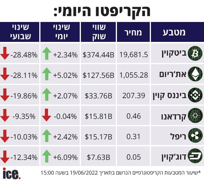 ביטקוין מתרומם היום ומצמצם מחיקה עם 2.34% נוספים למטבע. מחירו עדיין מתחת ל-20 אלף ועומד ברמה של 19,681.5 דולר ושווי השוק שלו עומד על 374.44 מיליארד דולר. השינוי השבועי מעיד על ההתרסקויות של השבוע האחרון בו מחק המטבע 28.48% מערכו.