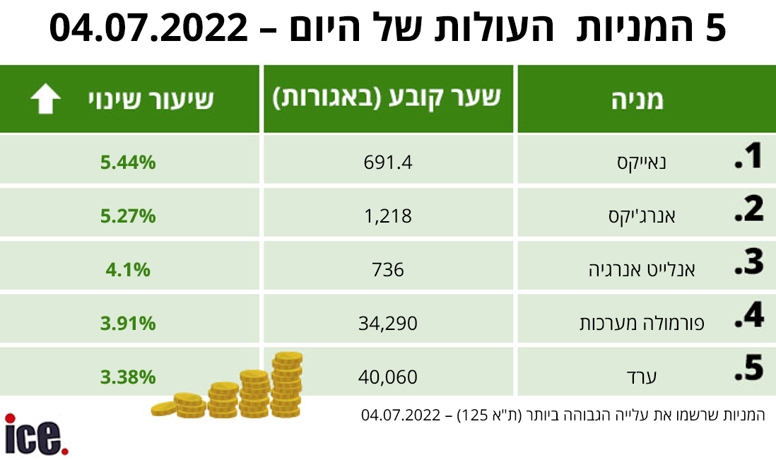 העלייה המשמעותית ביותר של היום נרשמה על ידי נאייקס, המספקת פתרונות סליקה לעסקים. החברה רשמה שינוי חיובי בשיעור של 5.44% למחיר של 691.4 אג' למניה; אחריה נמצאות שתי חברות מתחום האנרגיה הירוקה – אנרג'יקס, שממשיכה את המגמה של אתמול בעלייה נוספת בשיעור של 5.27% למחיר של 1,218 אג', ואנלייט, שעלתה בשיעור של 4.1% למחיר של 736 אג'; חברת התוכנה פורמולה מערכות, השולטת במטריקס, מג'יק וסאפיינס, רשמה עלייה בשיעור של 3.91% למחיר של 34,290 אג'; וחברת ההשקעות ערד, המחזיקה בחברת הנדל"ן ישרס ובחברת התוכנה מלם תים, זינקה ב-3.38% למחיר של 40,060 אג' בשעות הצהריים, לאחר שהודיעה על החלטה לפצל את אחזקותיה בישרס.