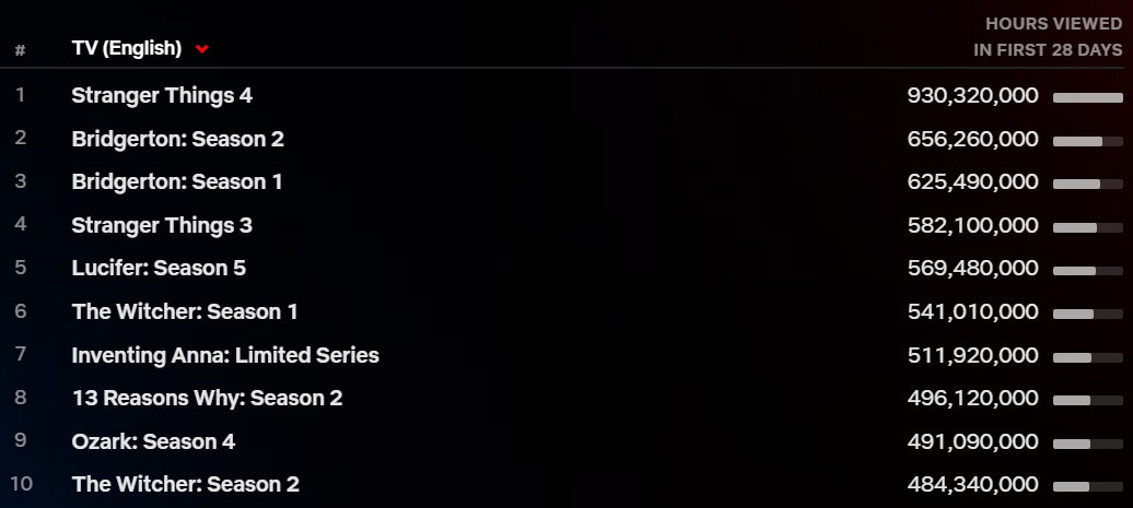 "הסדרה מחזיקה במקום הראשון בדירוג הסדרות הפופולאריות ביותר באנגלית (בכל הזמנים) עם 1.15 מיליארד שעות צפייה" – כך התגאתה נטפליקס בבלוג שלה שלשום (שלישי), עם חשיפת נתוני הצפייה המעודכנים בה לשבוע שהסתיים ביום ראשון. ואכן, באתר שמציג את הנתונים מדורגת "דברים מוזרים 4", הסדרה עליה מדובר במשפט הקודם, במקום הראשון בין הסדרות דוברות האנגלית עם מיליארד, 151 מיליון ו-240 אלף שעות צפייה. אבל רגע, יש המשך: המספר הזה נכון "ב-28 הימים הראשונים". (ובמקום השני אם מאחדים את החישוב עם הסדרות הזרות, שם כמובן מובילה "משחק הדיונון" עם 1.6 מיליארד שעות צפייה בתקופה המקבילה שלה).