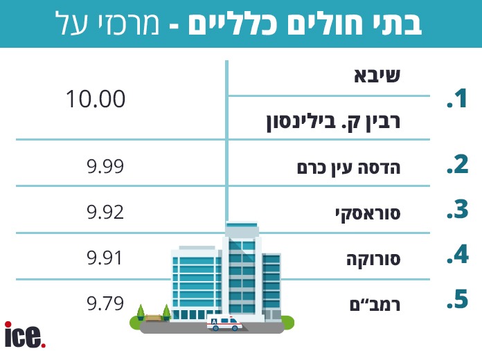 מבין בתי החולים המוגדרים "מרכזי על" - דהיינו, מרכזים רפואיים ענקיים באיזורים מטרופוליניים, קטפו את הציון המירבי המרכז הרפואי שיבא וכן המרכז הרפואי בילינסון. מבין בתי החולים הנחשבים "גדולים", היחיד שהגיע לציון המירבי הוא בית החולים ברזילי באשקלון. אחריו התמקם בית החולים "הכרמל" בחיפה עם ציון של 9.99, ובמקום השלישי התמקם בית החולים העמק בעפולה עם ציון של 9.98.