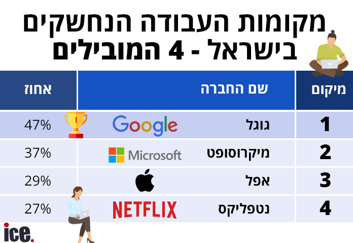 את המקום הראשון תופסת לא אחרת מאשר גוגל עם 47% התופסים את המעסיק כנחשק ביותר בישראל, לאחריה ממוקמות מיקרוסופט, עם 37% ואפל עם 29% אחוזים. נטפליקס ממוקמת במקום הרביעי אצל הישראלים עם 27%.